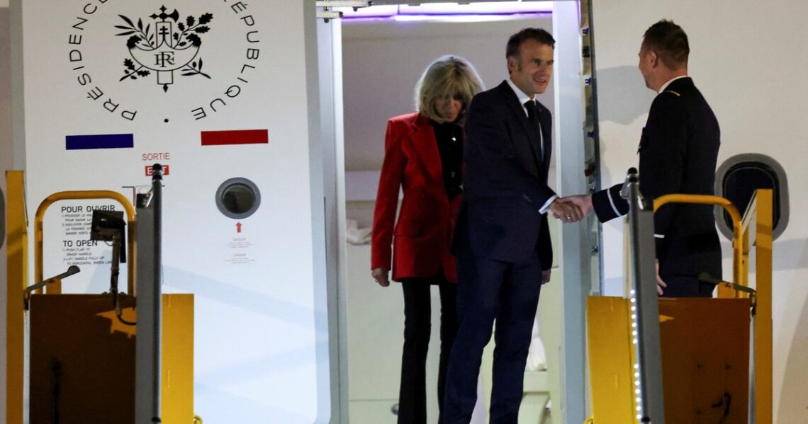 Macron parece sorprendido, se gira rápidamente y saluda a los medios con un gesto de la mano. La pareja baja las escaleras del avión y Emmanuel Macron tiende el brazo a su esposa, como es su costumbre, pero ella no lo acepta y se apoya en la baranda.
