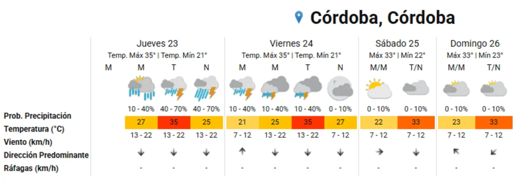 Para el viernes, se prevé una máxima de 35°C y una mínima de 21°C, con tormentas aisladas.
