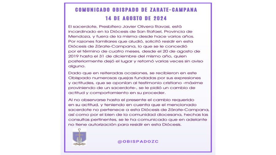El Obispado de Zarate-Campana comunicó recientemente que el sacerdote, Javier Olivera Ravasi, quien se encontraba incardinado en la Diócesis de San Rafael, Provincia de Mendoza, ya no tiene autorización para residir en esta diócesis.