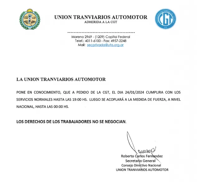 La Unión Tranviarios Automotor (UTA) garantizó la prestación del servicio el próximo 24 de enero, día en que se realizará la manifestación a nivel nacional.