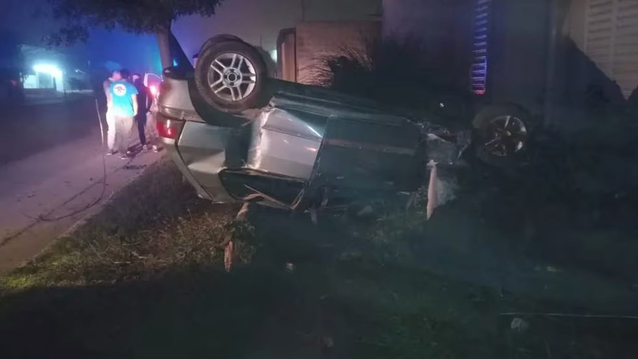 Un Renault Clio con cuatro jóvenes a bordo despistó, chocó contra un poste y terminó con las ruedas para arriba en la entrada de una vivienda. El propietario afirmó que los jóvenes que viajaban en el vehículo habían consumido alcohol. Incluso, acusó al padre de uno de los chicos de extraer una botella de fernet del auto.